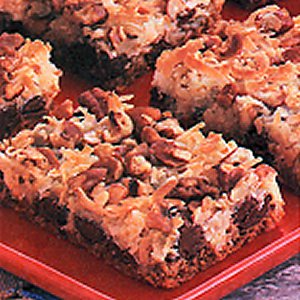 Graham cracker crust, topped with chocolate chips, coconut, and pecans.